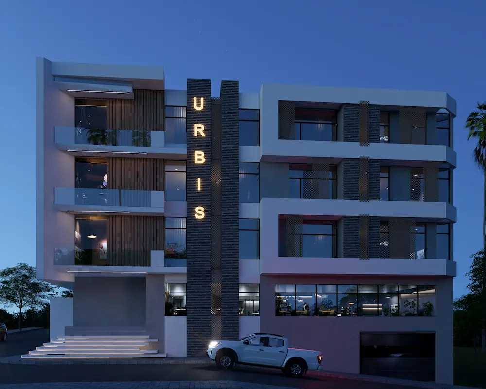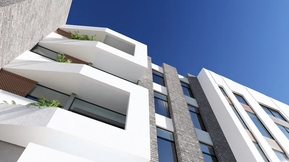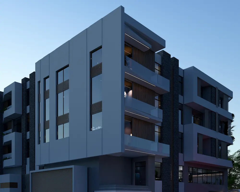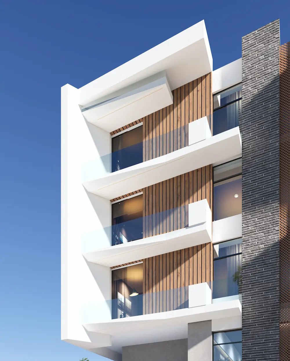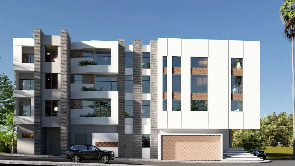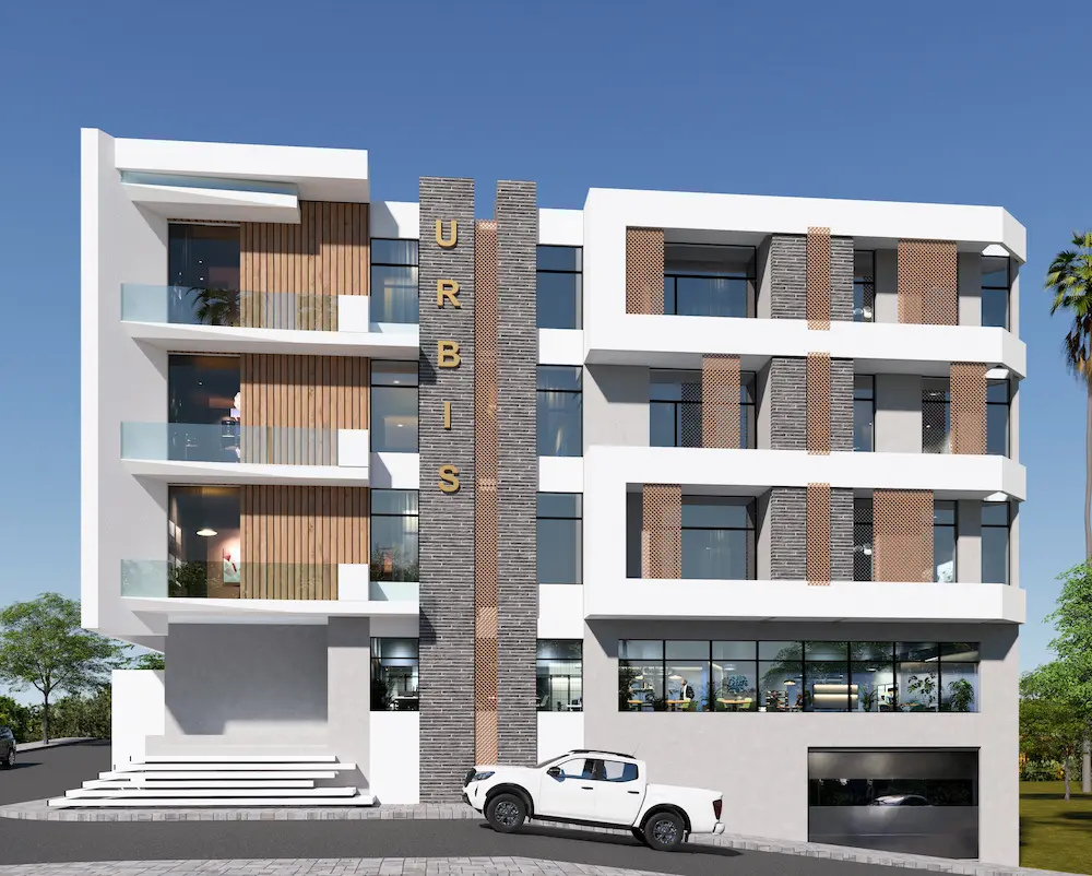 Construction d’un immeuble à usage mixte comprenant un sous-sol, des bureaux au rez-de-chaussée, 13 appartements résidentiels sur 3 niveaux et une terrasse sur le toit avec salle de sport et pergola.